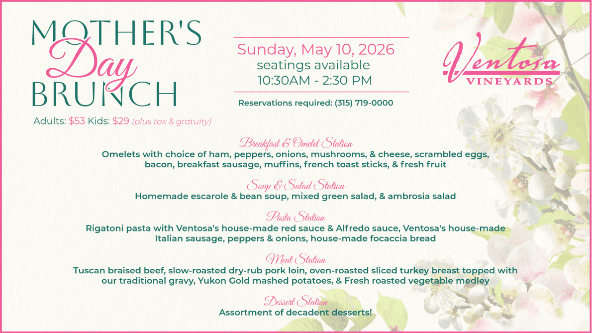 Mother’s Day Brunch at Ventosa Vineyards Sunday, May 10, 2026 Our brunch menu is back this Mother’s Day! Make Mom’s day extra special and treat her to a delicious brunch with a stunning backdrop to take beautiful photos. Seating available from 10:30-2:30pm Reserve your table P: 315.719.0000